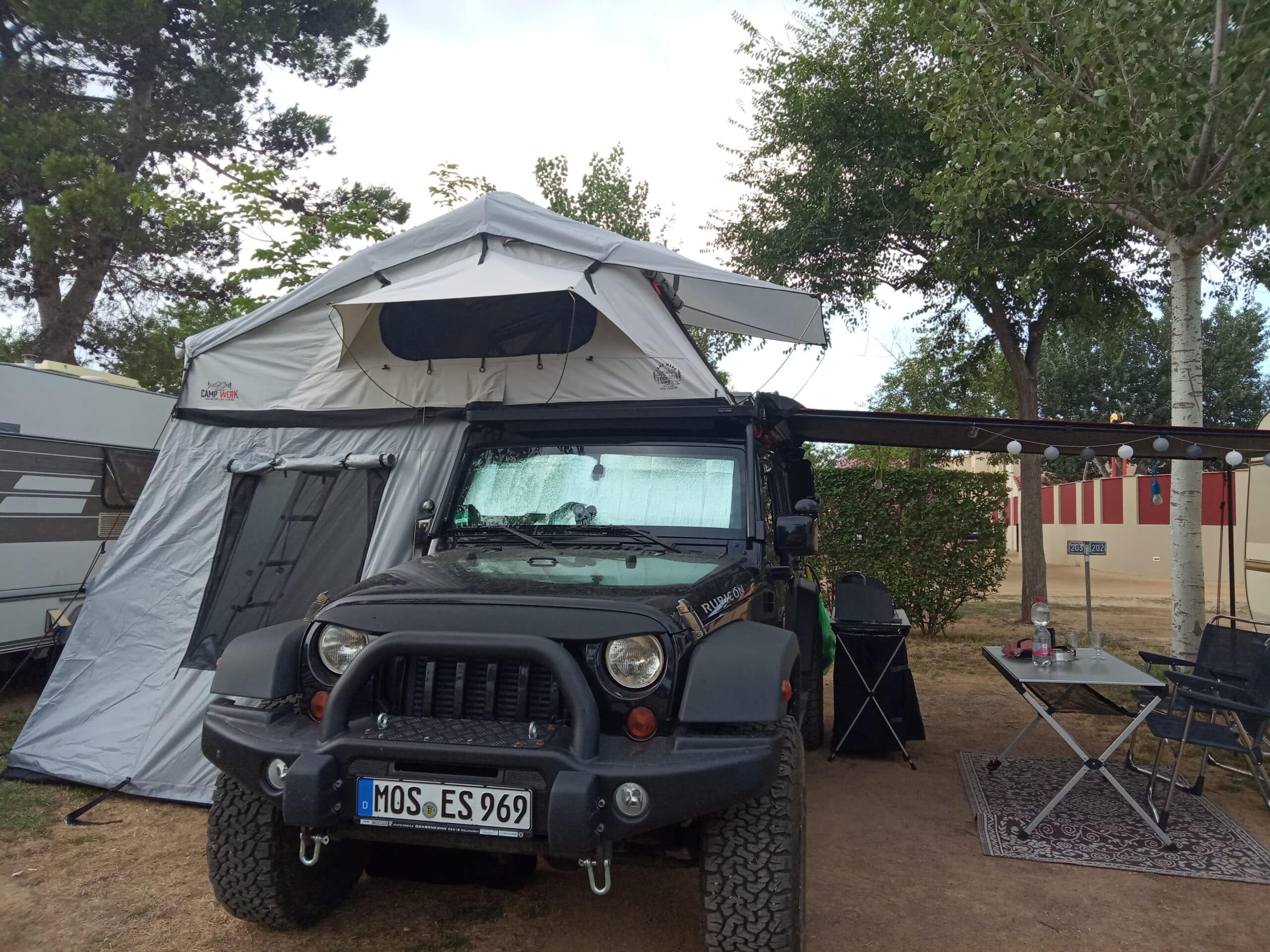Tente de toit avec auvent – Un auvent supplémentaire est une option super pratique pour avoir encore plus de place sur le terrain de camping en plus de ton espace de vie dans la tente de toit. Il peut être facilement fixé à ta tente de toit, de sorte que ta surface utile soit agrandie de quelques mètres. Tu peux utiliser l’espace supplémentaire de manière optimale pour t’asseoir ensemble avec des meubles de camping, pour cuisiner avec la cuisine de camping ou simplement pour te détendre.